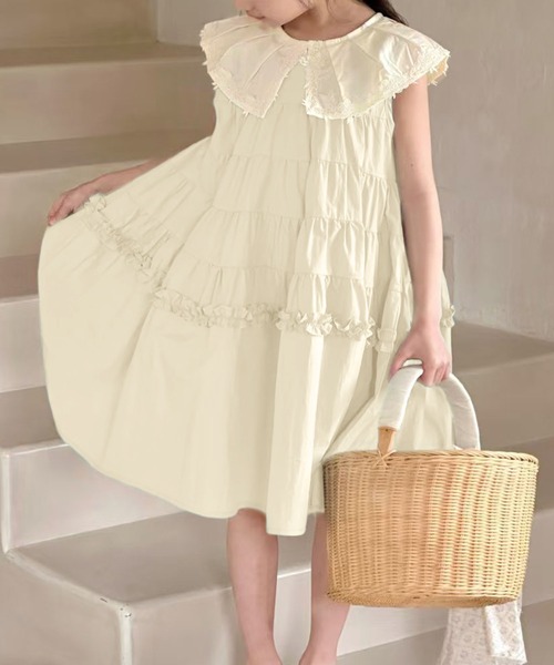 キーワード:ワンピース キッズ 子供服 ノースリーブ レース 台形 膝丈