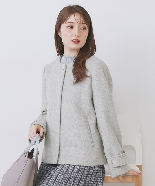 ・ノーカラーのすっきりとしたデザインが、顔周りを上品に引き立て、インナーとのレイヤードも楽しめます。