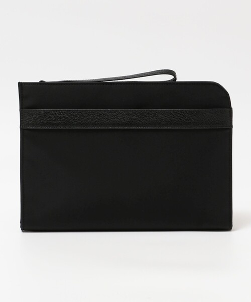 表地に撥水加工を施したポリエステル、デザインディテールに牛革を使用したクラッチバッグ。
