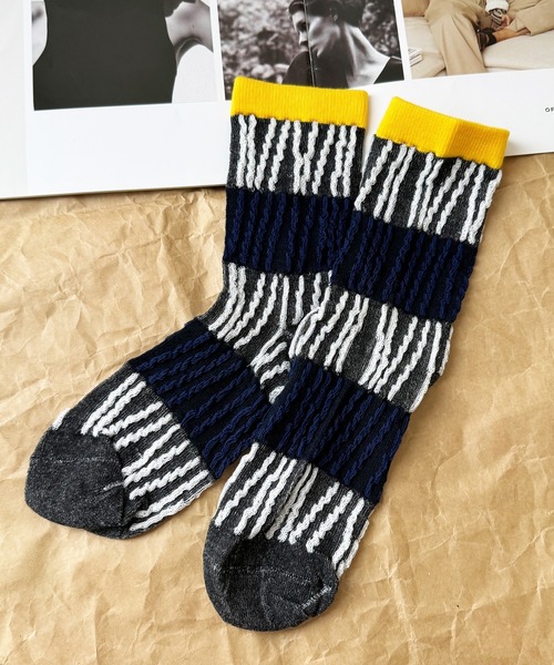 (3):ネイビー×イエロー(ストライプ立体柄)ネイビーとグレーのストライプに、イエローの差し色を効かせた立体リブソックス。
