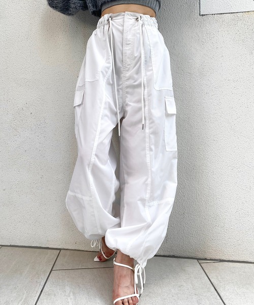 キーワード:カーゴパンツ レディース ウエストゴム ハイウエスト フルレングス ワイドパンツ 無地