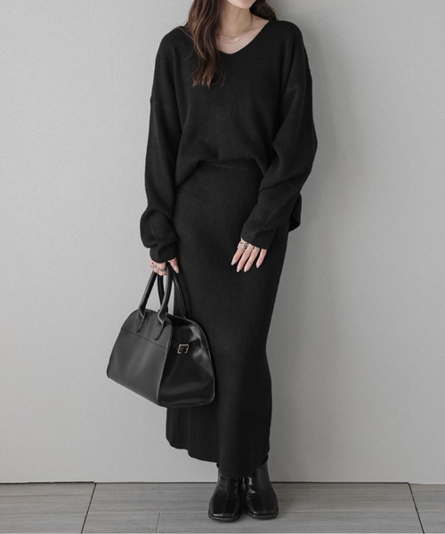 リブニットセットアップざっくリVネック×ドロップショルダーのゆったりトップスと