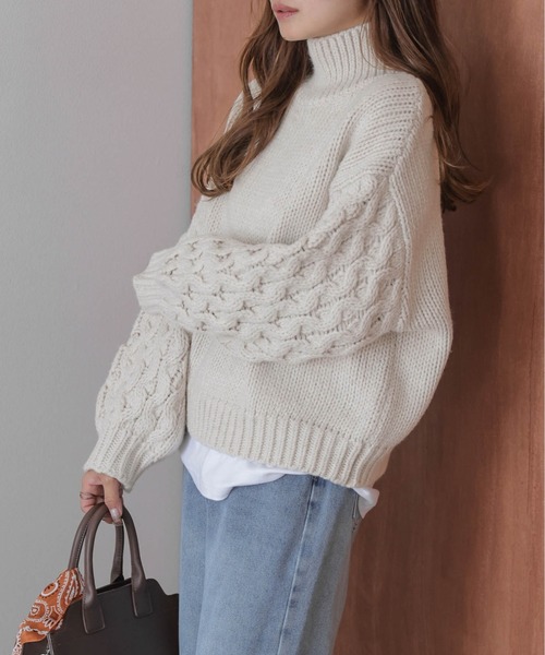 ハイネックニットプルオーバー袖のケーブル編みデザインがアクセントのニットプルオーバー。