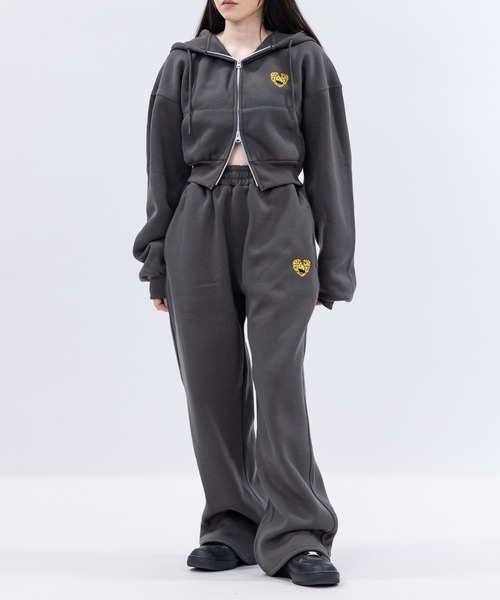 ショート丈のパーカーにワイドのスウェットパンツでスタイルアップ間違いなしのスウェットセットアップ。
