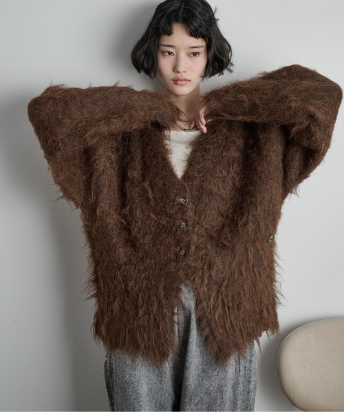 華やかなシャギーニットで仕上げたカーディガン。