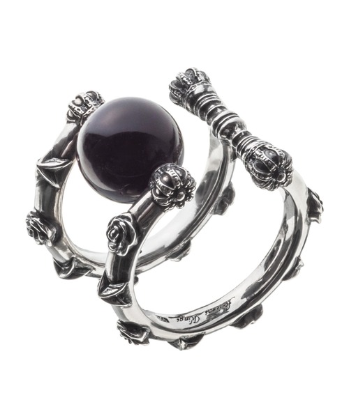 薔薇と星が交互に並ぶ華やかな2連イヤーカフ。耳の内側にはオニキスボールが輝き、現代アートのような印象的なデザインに。2連をつなぐ支柱には王冠モチーフと、アンティーク家具の脚を思わせる繊細な彫刻を施しました。ピアスホール不要で、耳に挟むだけの簡単装着。しっかりフィットし、着け心地も快適です。裏面にはブランド名と925刻印、3つのホールマーク付き。