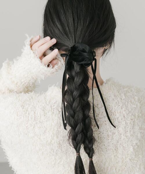 【くるんと巻き付く、ベロアロングリボン付きヘアカフ】●ポニーテールの結び目に差し込むと、くるん巻き付く簡単仕様