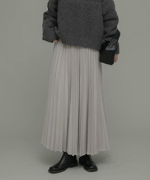 シーズンムードが高まるスエード素材のプリーツスカート柔らかなスエードタッチの素材にプリーツ加工を施し、ヒップや腰回りのラインをカバーしつつボリュームを抑えたすっきりとしたシルエットが特徴のスカート。