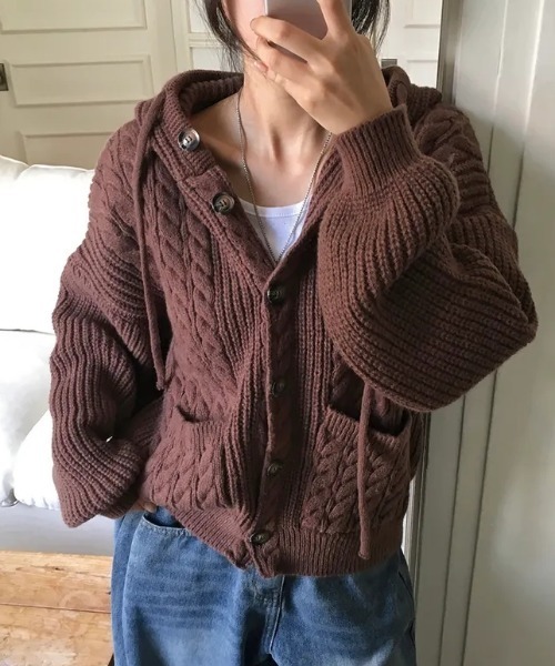 ふんわりとした編み地がかわいい、ケーブル編みのフード付きニットカーディガン。