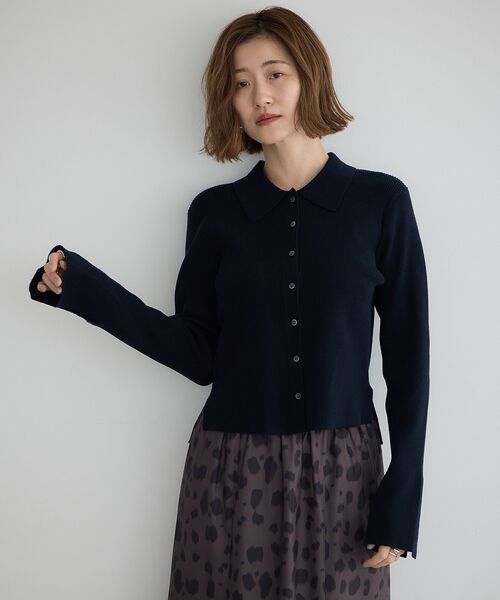 襟がアクセントの着心地優しいリブニットカーディガン。