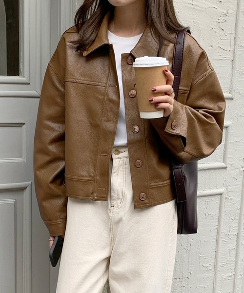 襟付きのきちんと感と、ショート丈の軽やかさを兼ね備えたPUジャケット。