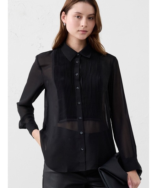 透け感のある軽やかな素材で仕立てたタキシードビブブラウス