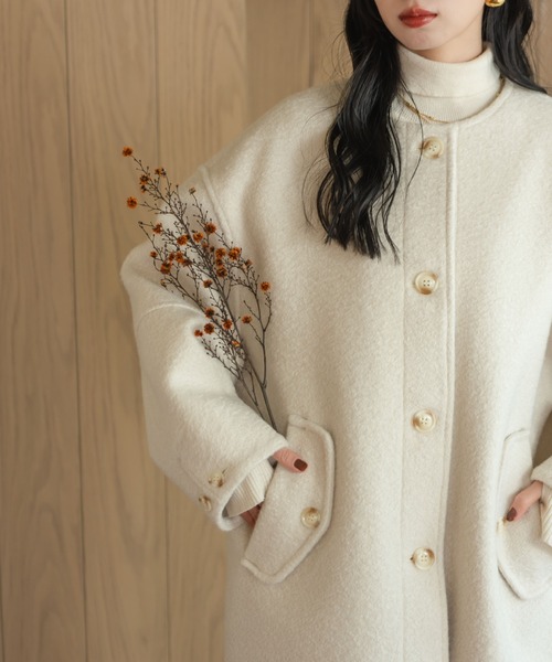 秋冬ムードの高まるブークレ素材のノーカラーコート。