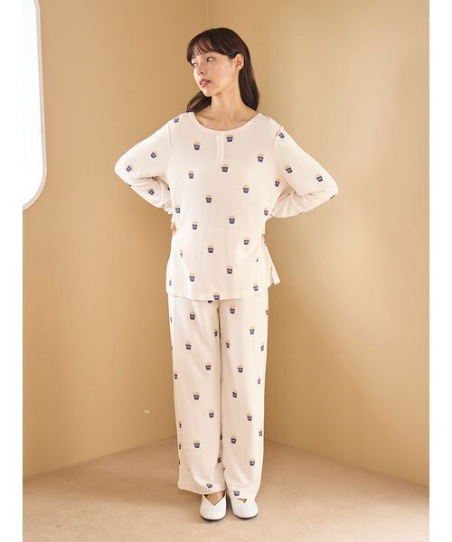 冬の温かいおうち時間に食べたくなる、美味しいモチーフを総柄プリントしたワッフル素材のルームウェアシリーズ。ベーシックなストレート型ではきやすいロングパンツです。両脇と右後ろにポケットを付け、デイリーにご使用いただけるデザイン。色はポップコーン柄のクリーム、アイスクリーム柄のピンク、ケーキ柄のラベンダーの3色をご用意しました。同シリーズのロンTに合わせたり、同時期に展開するジェラート3BDシリーズとコーディネートするのもおすすめです。