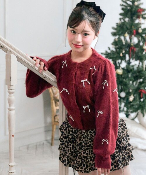 ・パールリボンをフロントに散りばめた、ガーリーデザインのニット。