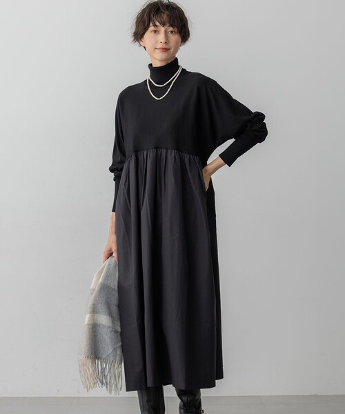 タートルネックニットに布帛スカートをあわせた異素材コンビワンピース
