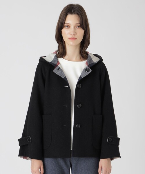 後ろ下がりシルエットがポイントのフード付きリバーシブルコートです。