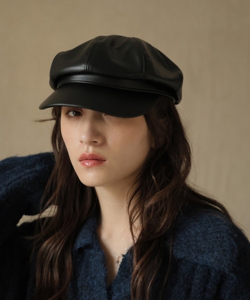 艶やかなフェイクレザー素材を使用した、モード感漂うキャスケット。