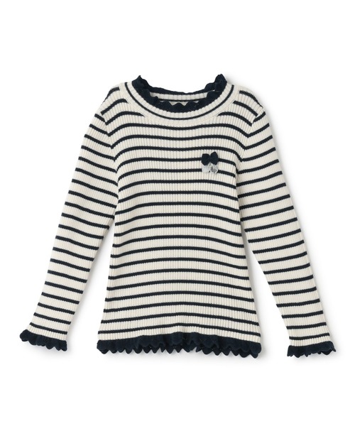 1枚でも、羽織ものやジャンパースカートのインナーとしても合わせても使える、オールマイティなリブのボーダー柄ハイネック綿ニットです。ウォッシャブル素材で、お手入れも簡単。左胸には、さんくらんぼのワンポイントワッペンが、さりげなく付いています。袖先と裾のフリル仕様も、可愛らしいポイントです。