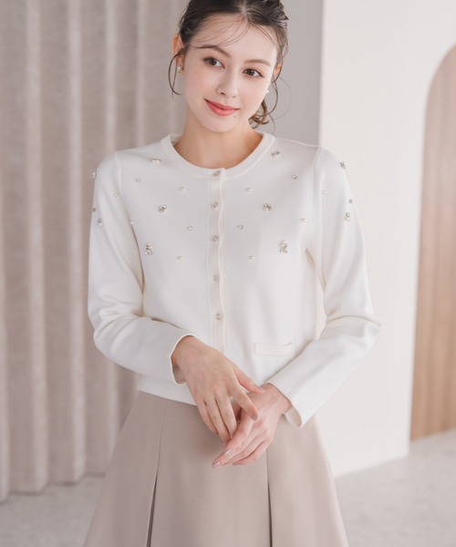 ビジューとパール風のあしらいが華やかに輝くカーディガン。繊細な刺しゅうが上品さを引き立て、