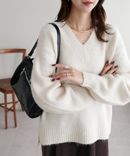 vネックになっていることや、起毛感のある素材がシンプルでもおしゃれ見えします!