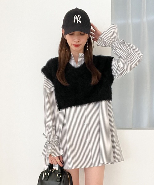素材:【アイボリー×ブルーストライプ08、ブラック×グレーストライプ09】 ニット: ナイロン100% シャツ: ポリエステル54%、レーヨン46% 【グレー×オフホワイト18】 ニット: ナイロン100% シャツ: 綿100%
