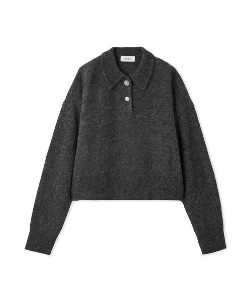 【顔周りをぱっと引き立てる、華やかビジューボタンが◎。ふんわり柔らかい着心地も追求したポロ襟ニット】