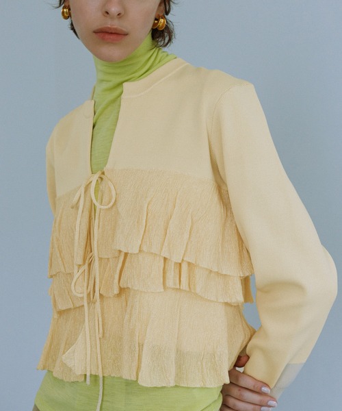 ランダムなフリルが着映えするフェミニンなニットカーディガン。