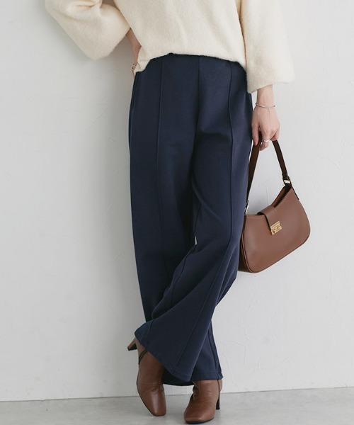 表はつるっとした表面感もきれいめポンチ素材を使用し、内側は毛布のように包み込む、柔らかな肌触りの裏起毛を使用。ウエストは後ろがゴムの仕様で楽な履き心地。前はフラットで綺麗見えなのに、内側の紐で好みのサイズに調整が可能です。