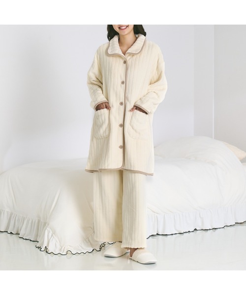 室内コートのようにゆったりと羽織れるトップスと、同素材のボトムがセットになった暖かいルームウェアです。