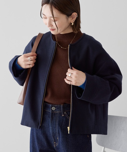 首元はノーカラーですっきりと仕上げ、ゴールドジップが高級感もプラス。