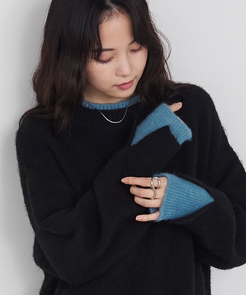 さりげなくレイヤードしているように見える、袖口と襟ぐりの二重仕立て仕様が特徴のニットプルオーバー。