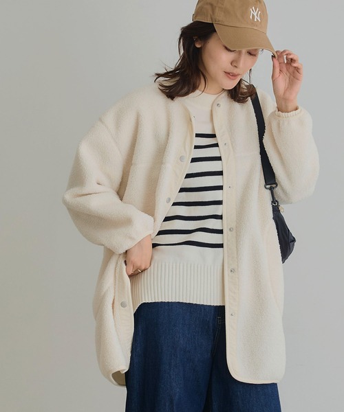 ・ふんわりとした風合いながら着膨れしない、程よいボリューム感のボアを使用したノーカラーアウター。