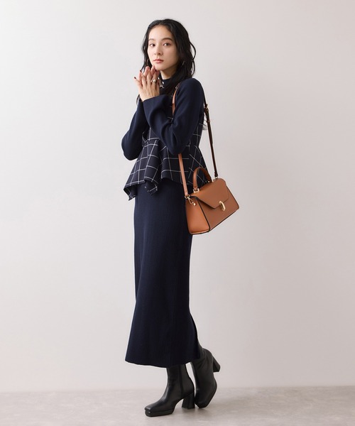 伸縮性のあるリブニットワンピと、今年らしいチェック柄がポイントのチェック生地ビスチェ。