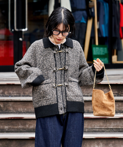 メタルフックが映える、存在感のあるミックスニットカーディガン●フロントにヴィンテージライクなメタルフックをあしらった、古着テイストのニットカーディガン
