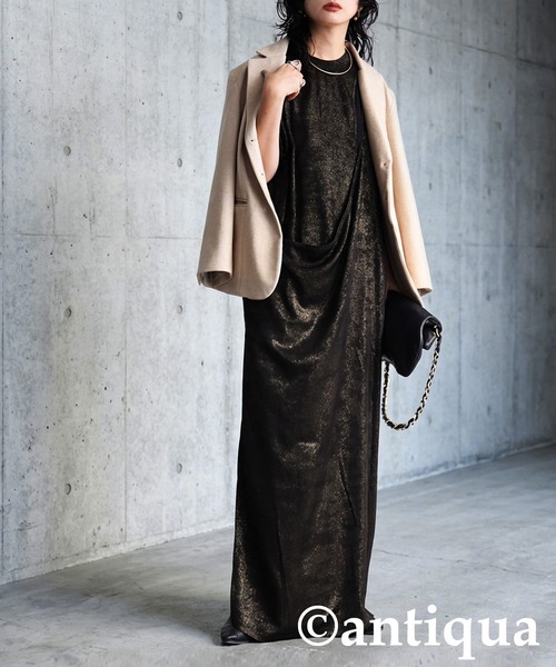 フランスの素材展示会“プルミエール・ヴィジョン”に出展するテキスタイルメーカーのラメ混素材を使用したロングワンピースです。