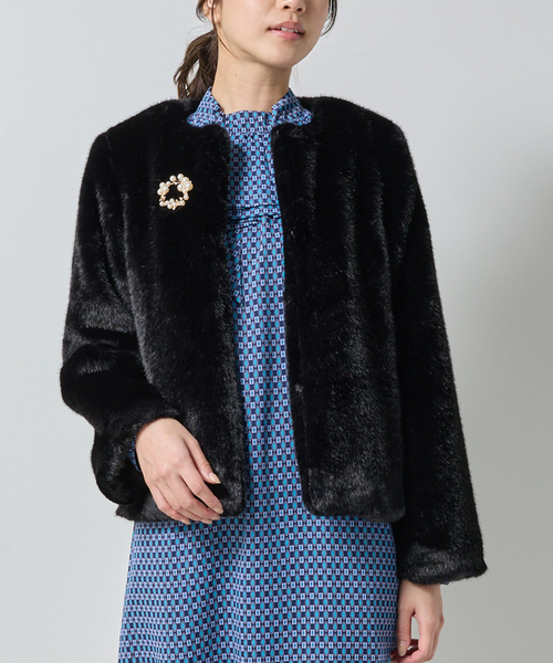 今季のトレンドアイテムであるエコファーを、暖色系のワンカラーで大人っぽく仕上げたジャケット。首元は、あえてシンプルなクルーネックデザインを用いることで、様々なインナーとも合わせやすく着回し力を底上げします。付属のブローチはクラシカルな雰囲気を醸し出し、気分やコーディネートで取り外しができるのも嬉しいポイントです。