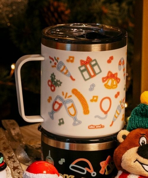 クリスマス気分を盛り上げる、ホリデーデザインのステンレスマグ。