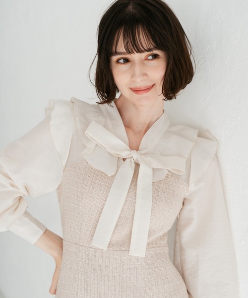 上品で可憐な雰囲気が魅力のボウタイワンピース。光沢感のあるツイードに、シアーをドッキングさせることで、クラシックな印象に抜け感を与えました。程よいセミマーメイドのシルエットで、動きやすさと女性らしさを演出します。デイリー使いはもちろん、ディナーや集まりなどのちょっとしたイベントにも大活躍します。
