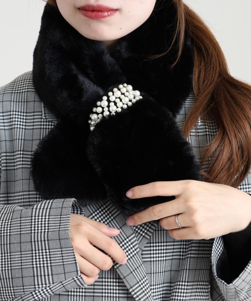 ■pointパールとビジューが華やかなフェイクファーストールコーデが華やかになるフェイクファーのストール。