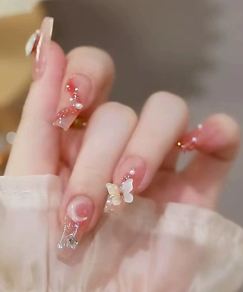 バタフライやリボンをメインモチーフにした、キュートなデザインのネイルチップ。