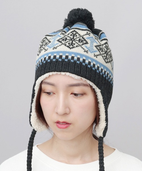 冬らしい雪柄の織り柄が寒い日のスタイリングにぴったりなニットワッチ。トップの大きめのポンポン、耳当てに配置されたブランドタグがアクセントに。
