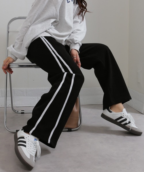 裏起毛の楽チンスウェットパンツトレンドのカジュアルコーデにぴったり、裏起毛が温かいラインパンツ。