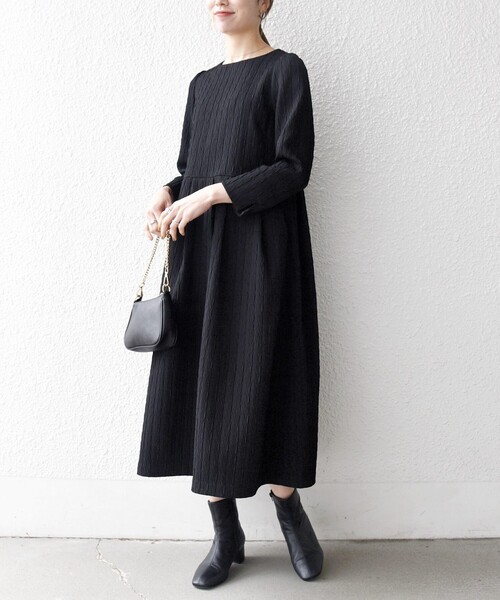 〈デザインポイント〉ふんわりと広がるフレアシルエットが女性らしい、クルーネックワンピース。