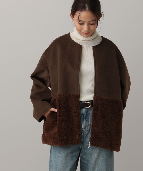異素材のボア切り替えが目を引くノーカラーコート。
