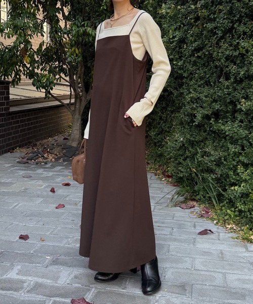 ・体のラインを拾いにくい、ほのかにAラインに広がるキャミワンピース。