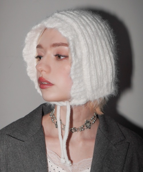 ふわふわした起毛デザインと、緩い雰囲気のレースデザインがガーリーで可愛いニットボンネット。