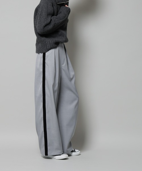 ルーズな抜け感とマニッシュさを持ち合わせたトレンド感あるワイドパンツ。落ち感のある素材とサイドラインが縦のラインを強調しキレイ目なシルエットに。スラック感覚で着用でき、トップスと合わせやすい一着です。