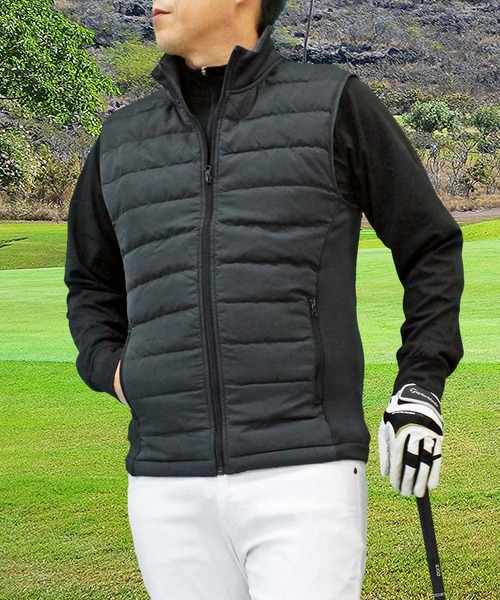 ダウンベストの襟とサイドからバックはジャージ素材で