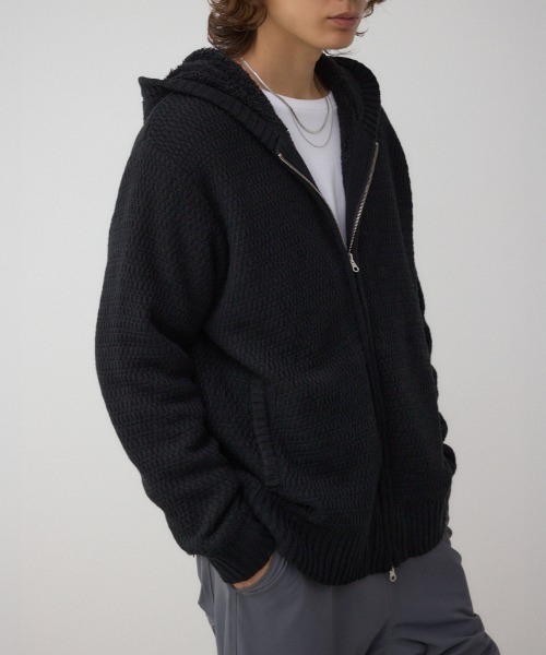 身頃とフード裏に裏ボアを配し、ニットながらアウター感覚で着られる保温性を実現。